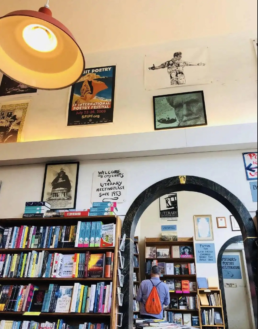 旧金山北海滩的哥伦布大街,是这群抗拒者的精神家园,城市之光书店与维苏威咖啡屋即是中枢性标。1953年,费林盖蒂创立的城市之光,是好意思国首家专营平装书的零丁书店,取名自卓别林电影,专为小众前锋体裁驻足。金斯堡、盖如阿克们逐日在此齐集,朗读新作,进行想想交锋,金斯堡更在留言簿写下“这里是诗歌的避风港”。往时书店还藏着一个狡饰旯旮,专门存放文东说念主们的手稿,费林盖蒂逐日暗暗整理,只怕被当局搜检,如今这里的手稿已成相当史料。盖如阿克曾经在书店“偷藏”威士忌,读累了便小酌一口,被费林盖蒂发现后两东说念主反而分享,这个旯旮自后也成了搭客打卡的亮点。
