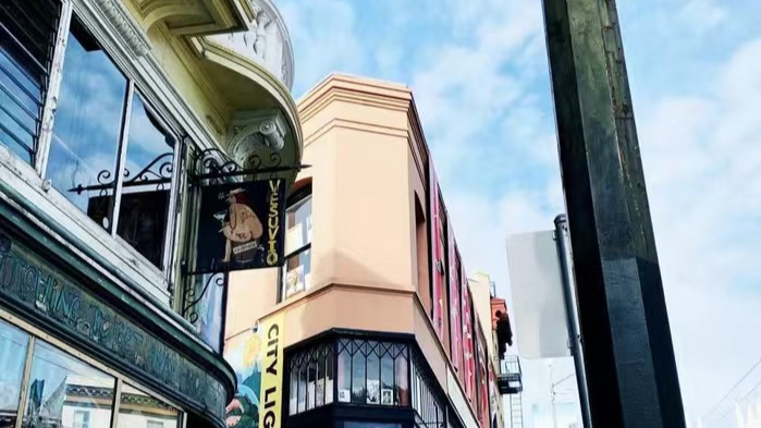 旧金山盖如阿克巷和紧靠巷口的维苏威咖啡屋(最左边)