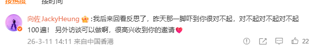 向佐也在驳倒区谈歉:我自后回看反念念了,昨天那一脚吓到你很抱歉,抱歉抱歉抱歉100遍! 另外访谈可以作念啊,很欢欣收到你的邀请。