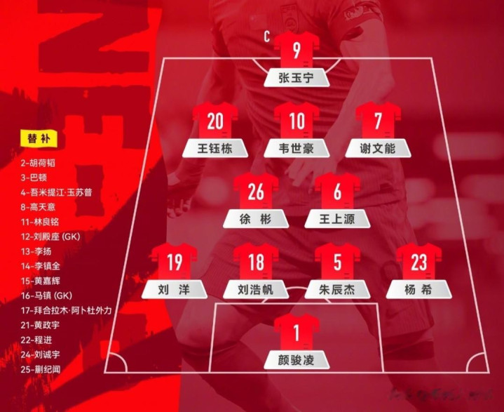 1.张玉宁(队长)突前,死后是王钰栋、韦世豪、谢文能。