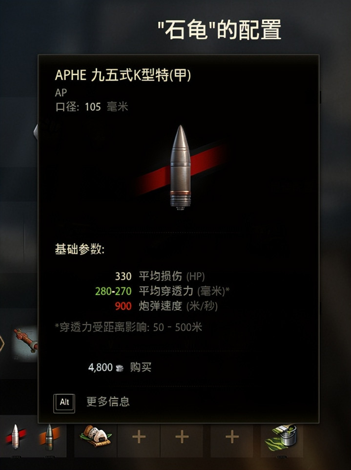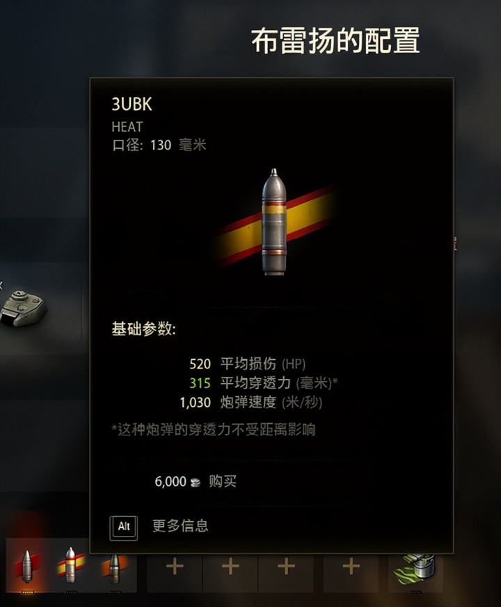 炮弹方面,布雷杨的银币弹是255毫米穿深,500衰减仅10毫米的高速AP,很稳健打钱;金币弹是调换弹速,穿深315毫米的HEAT。