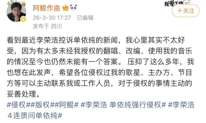 近日,李荣浩指控单依纯在其演唱会上强行侵权翻唱《李白》一事激勉热心后,多名音乐东说念主接踵发声维权,并敕令侵权方主动接头,妥善处分版权事宜。