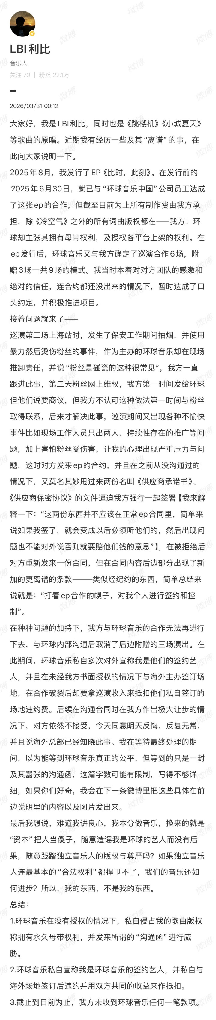 3月31日零时许,凭借《跳楼机》《小城夏天》等热点歌曲走红的音乐东说念主LBI利比在酬酢平台发布长文,控诉人人音乐在两边EP及巡演配合经过中存在侵占版权、暗自签约、未付款项等多项不妥举止,激勉热心。