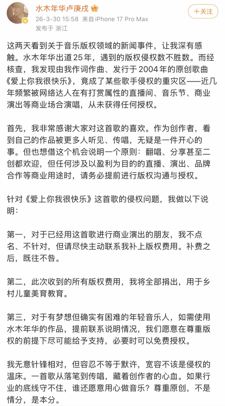 水木年华卢庚戌发文称,由其作词作曲、刊行于2004年的原创歌曲《爱上你我很高兴》是某些歌手侵权的重灾地——近几年频频被收罗达东说念主在有打赏属性的直播间、音乐节、生意献艺等生意地方演唱,从未得回任何授权。他喊话侵权者,“我不点名、不针对,但请尽快主动接头我补上版权用度。补费之后,既往不咎。”并默示这次收到的所有版权用度将沿路捐出,用于乡村儿童好意思育陶冶。关于有梦念念但确乎有盘曲的年青音乐东说念主,如需使用水木年华的作品,提前接头评释情况,“咱们情愿在尊再版权的前提下尽可能赐与维持,必要时不错免费授权。”