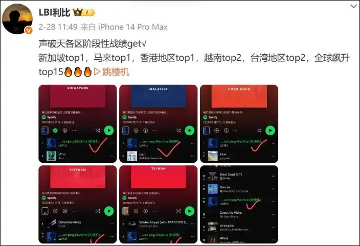 《跳楼机》于2025年1月23日上线国外流媒体,适度2025年6月3日,其在Spotify的播放量依然跳跃5400万。此前歌手LBI利比曾在本年2月28日发文称,《跳楼机》在各区阶段性战绩为:新加坡top1,马来top1,香港地区top1,越南top2,台湾地区top2,全球飙升top15。