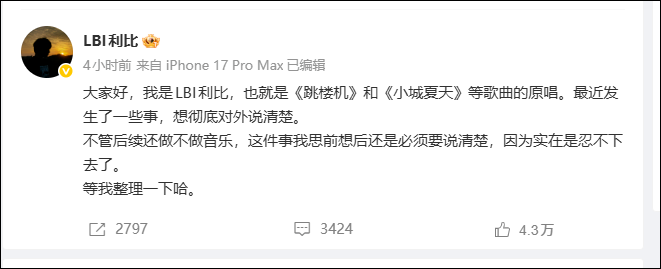 今天00:12,利比再更新微博,锋芒直指环球音乐中国,控诉其长期侵占版权、主理演唱会保安渎职致粉丝受伤、诞妄宣传、剥削收益等手脚,甚而暗示不吝赌上音乐生存也要揭露真相,激发全网热议。