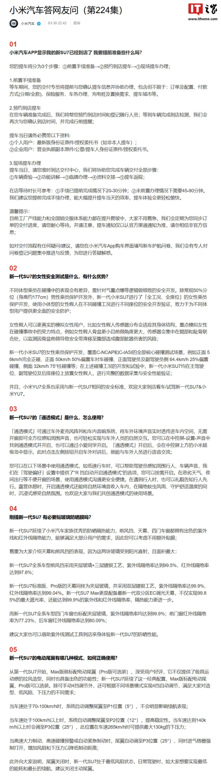 IT之家3月30日音信,小米汽车官方本日发布了答网友问(第224集),针对新一代SU7的女性安全测试、「通透方法」怎样使用、电动尾翼有哪几种方法等问题进行了解答。