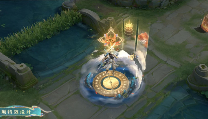 关羽的回城殊效加入了多数的文化元素,刺桐花和罗盘的殊效作念得很棒。