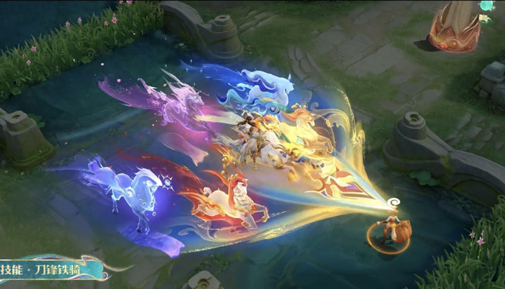 最初来看最具亮点的冲锋姿态大招,使用后能召唤五色战马,其中的配色及造型即为其他马年规则皮肤所属强者的神骥,红色的对应狗尾续蝉,粉色的对应云缨,蓝色的对应朵莉亚,金色的对应狄仁杰,紫色的对应马超。