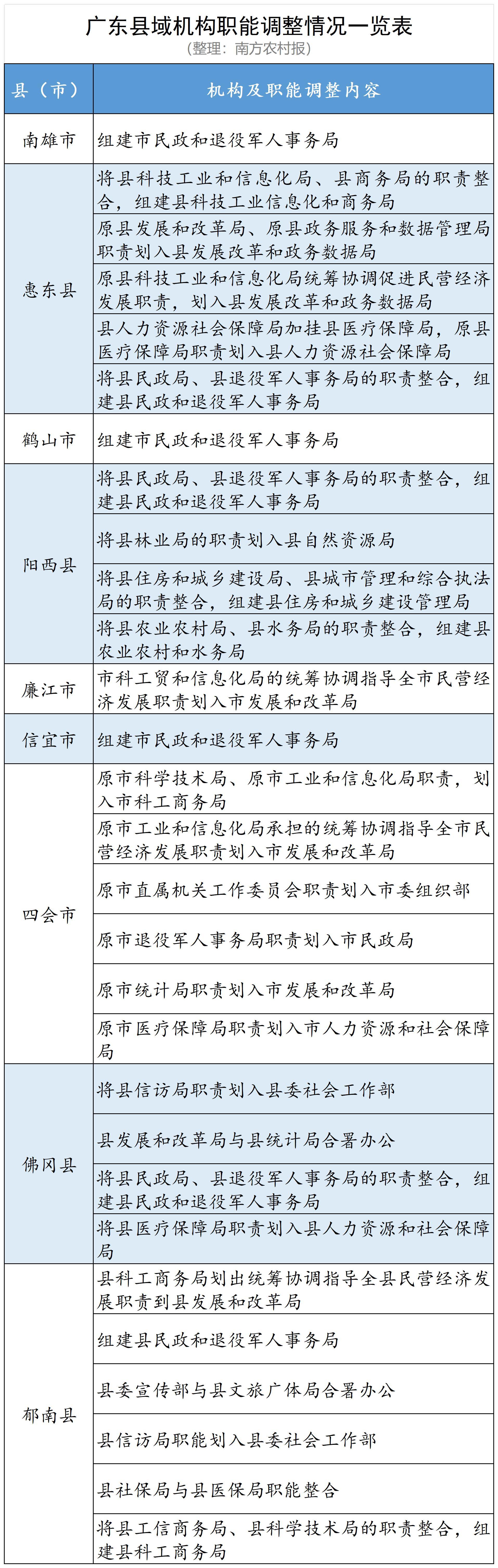 其中,南雄市、惠东县、鹤山市、阳西县、信宜市、佛冈县和郁南县等7地均组建了“民政和退役军东谈主事务局”,原四会市退役军东谈主事务局职责划入四会市民政局;四会市、郁南县、惠东县和廉江市等地工信和商务等系统承担的统筹合作领导全市民营经济发展职责,均划入各地发展和篡改局;惠东县、四会市、佛冈县和郁南县将医疗保险局职责划入东谈主力资源和社会保险局。