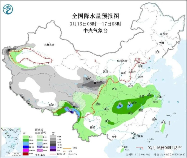 中央征象台展望,来日,内蒙古东北部、黑龙江中部和西北部、吉林中部、辽宁、新疆西南部、西藏北部、青海大部、甘肃南部、川西高原西部和北部等地部分地区有小到中雪或雨夹雪,其中,辽宁北部、新疆西南部、西藏东北部、甘肃南部等地部分地区有大雪。西藏东南部、湖北中东部、安徽大部、江苏大部、湖南西部和北部、江西北部、贵州东部等地部分地区有中到大雨,其中,西藏东南部等地部分地区有暴雨。